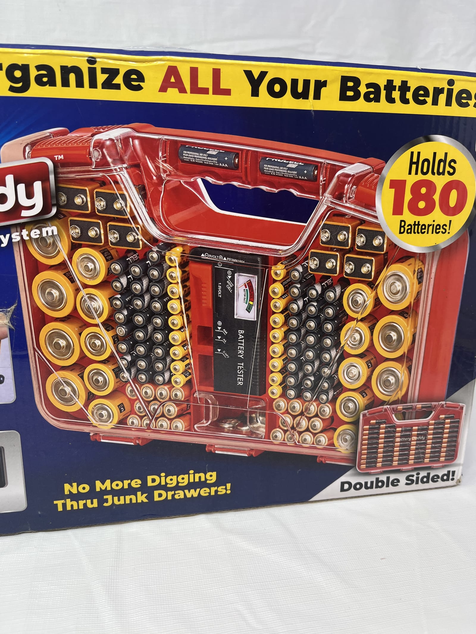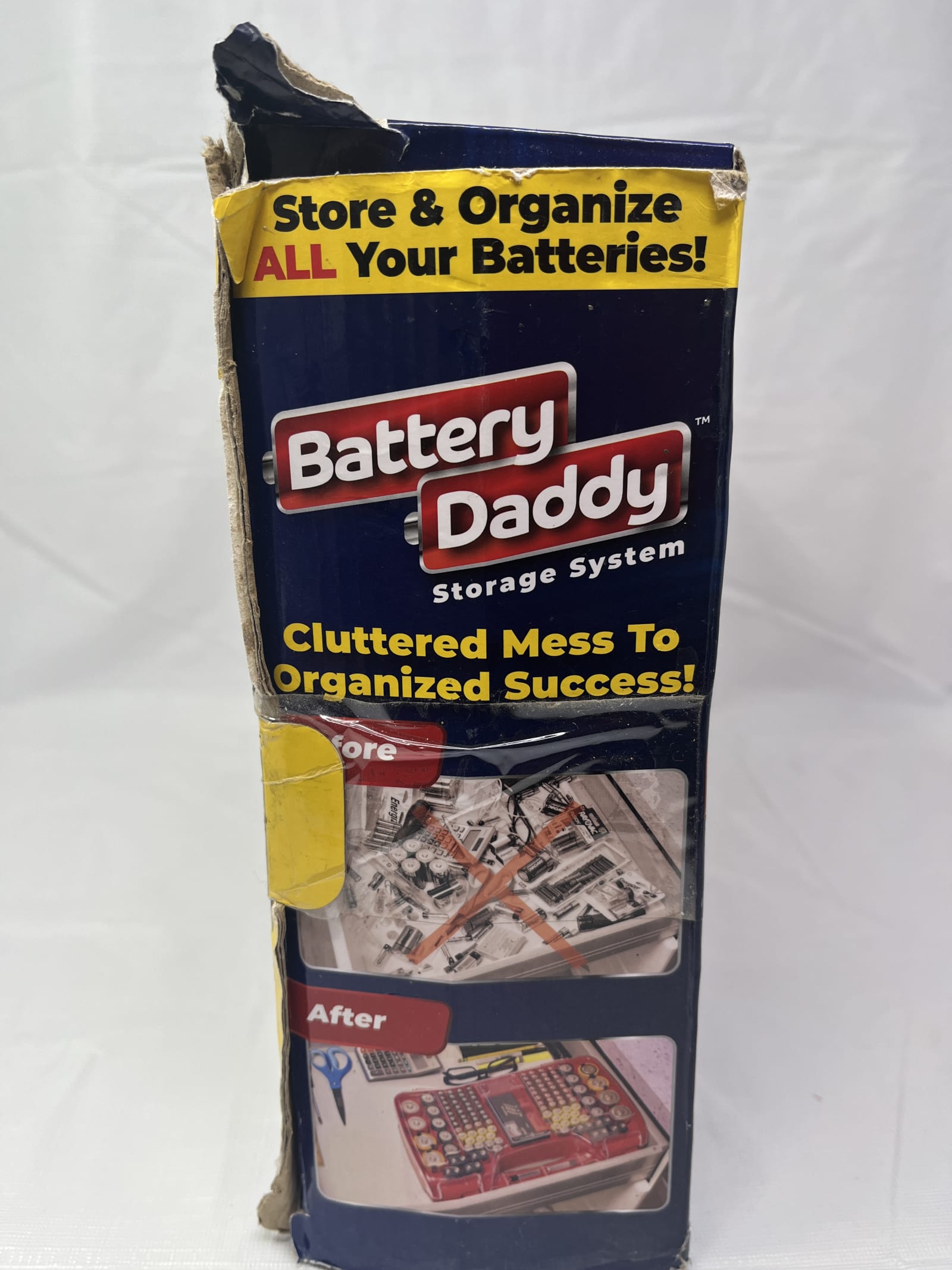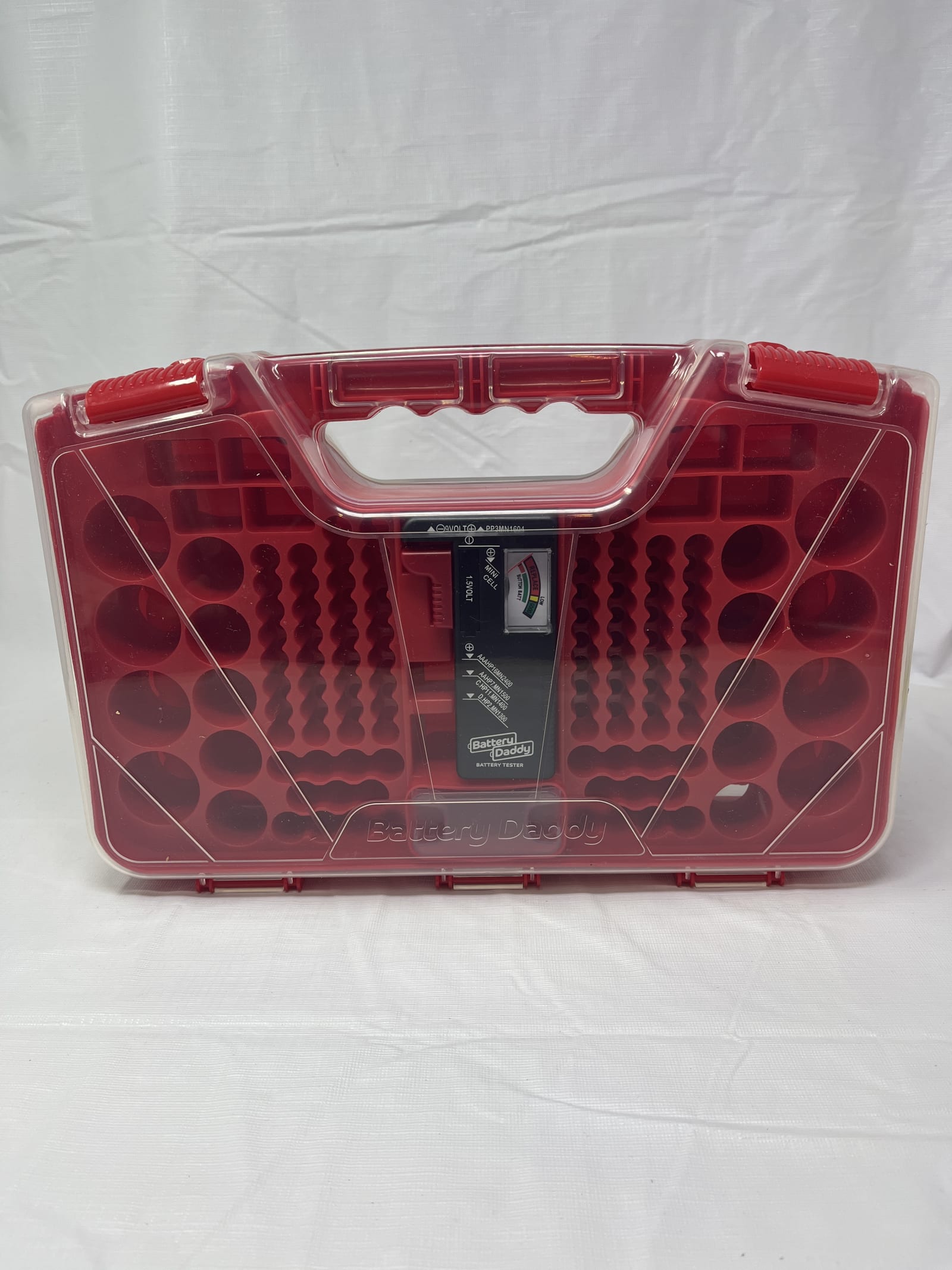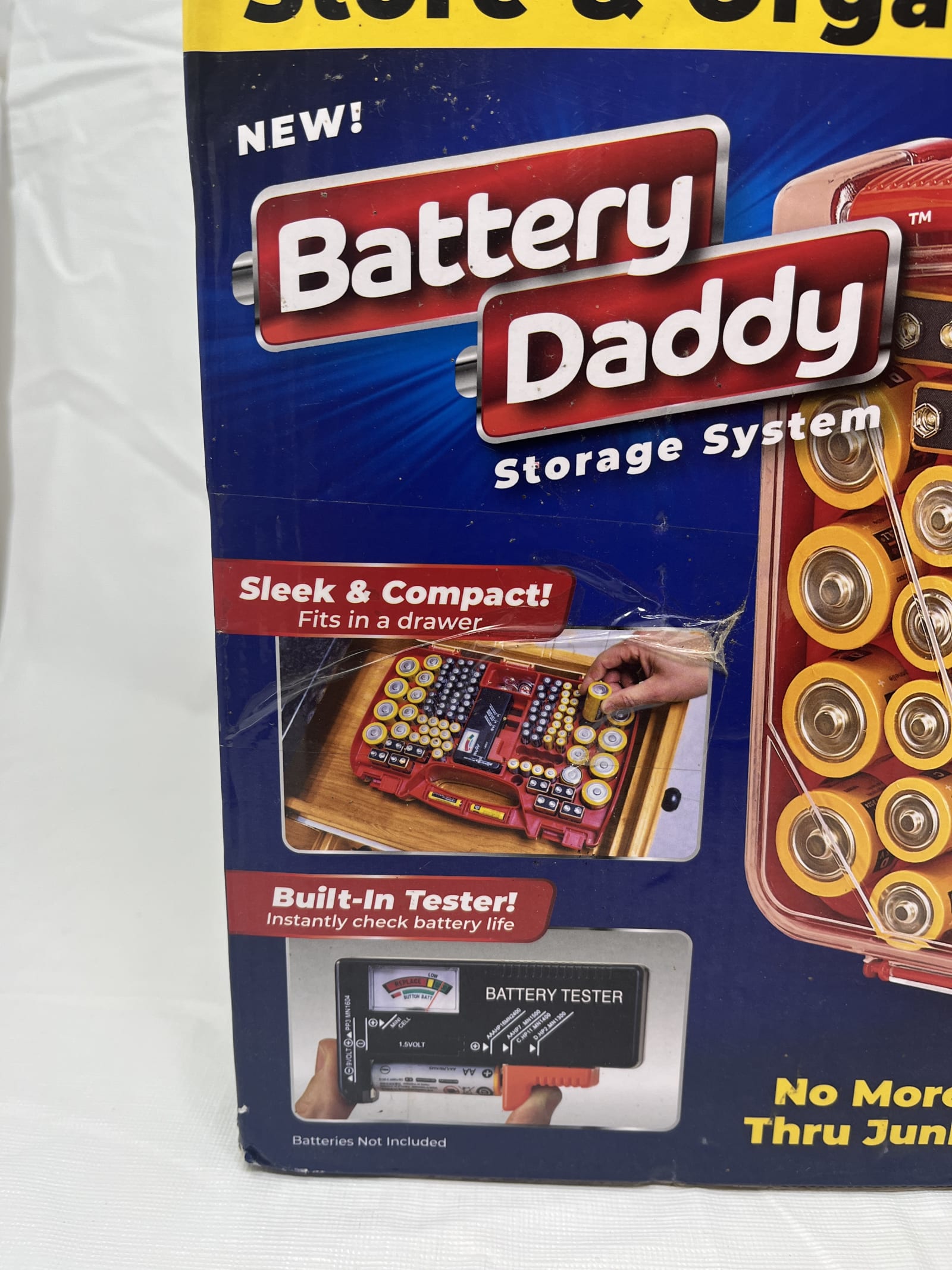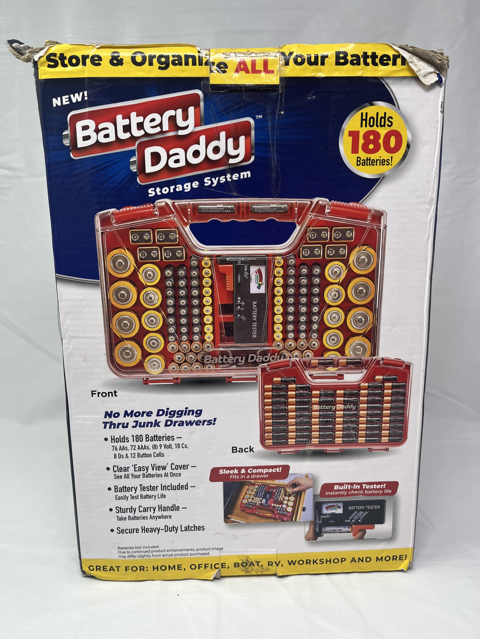 This is a Battery Daddy storage and organization system with a built-in battery tester. It holds up to 180 batteries of various sizes in a compact, double-sided carrying case. The box has wear and has been taped, but the item itself is in excellent, unused condition.