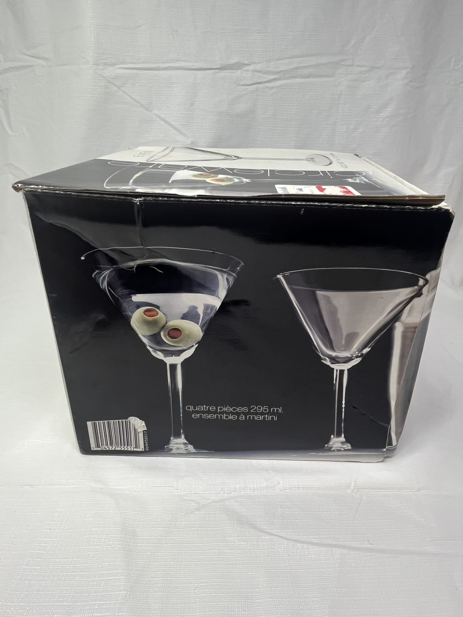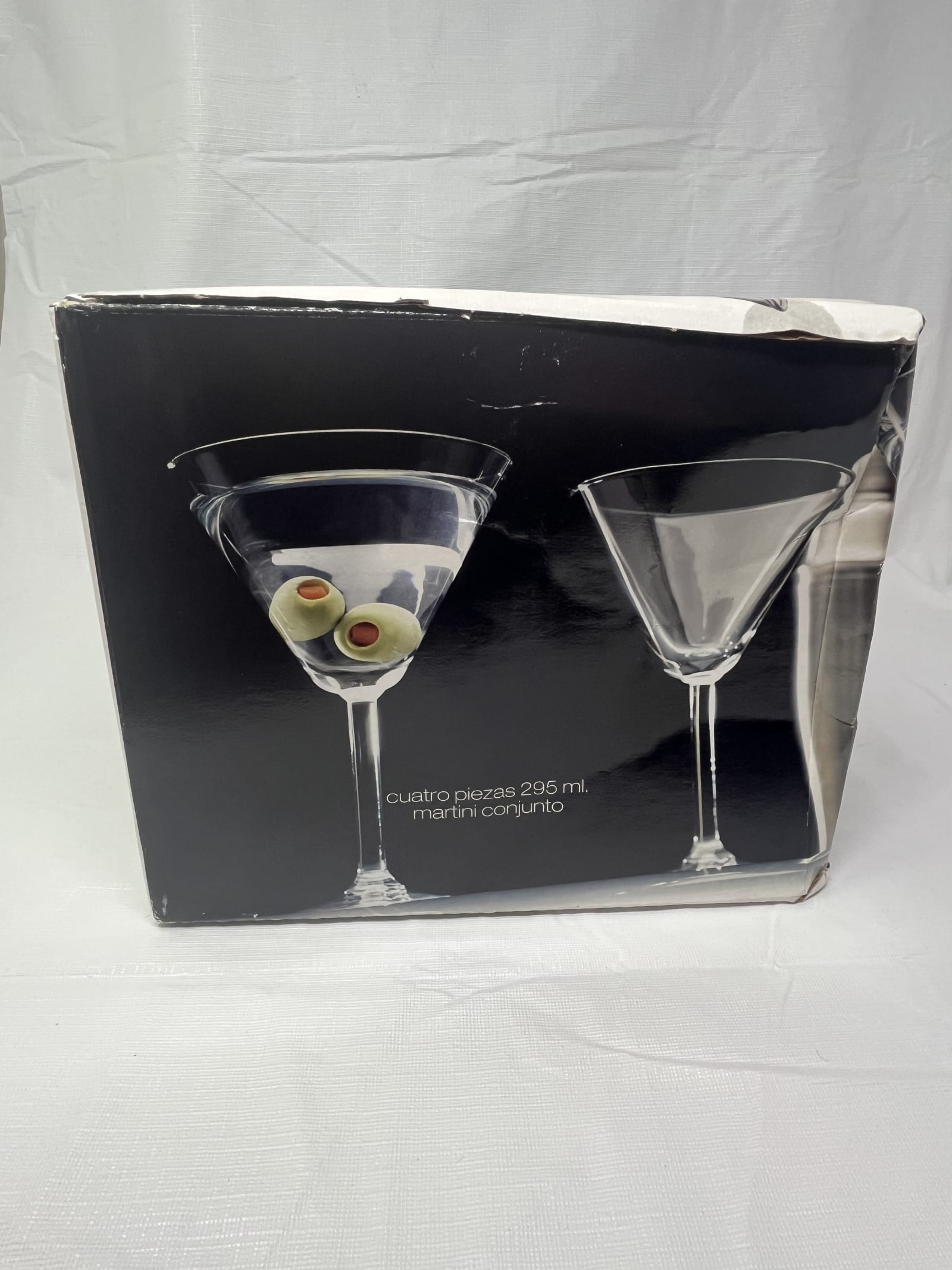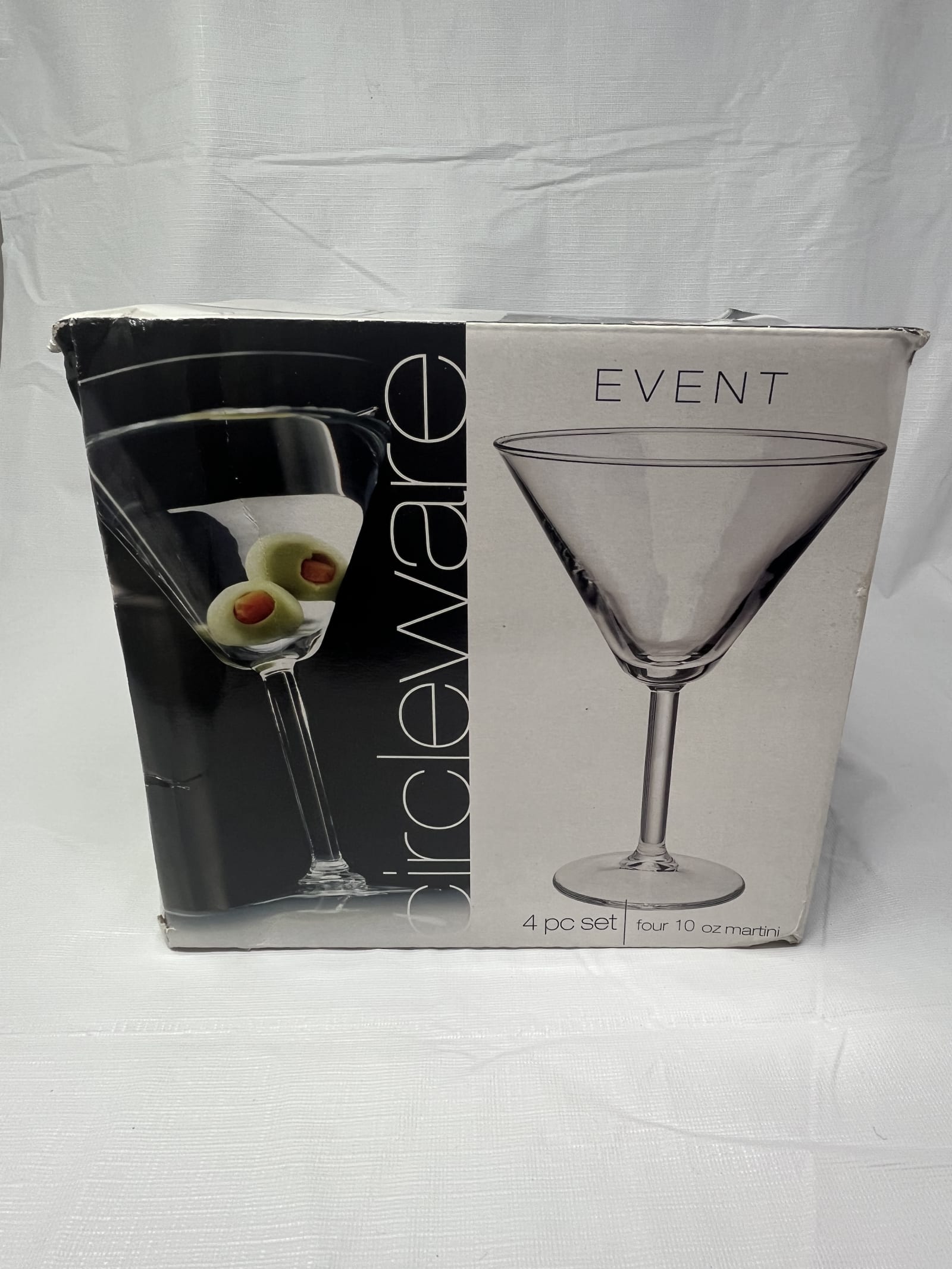 This is a Circleware Event 4-piece martini glass set, model 55517. Each glass holds 10 oz and features a classic martini silhouette with bright, clear glass perfect for entertaining or home bar use.