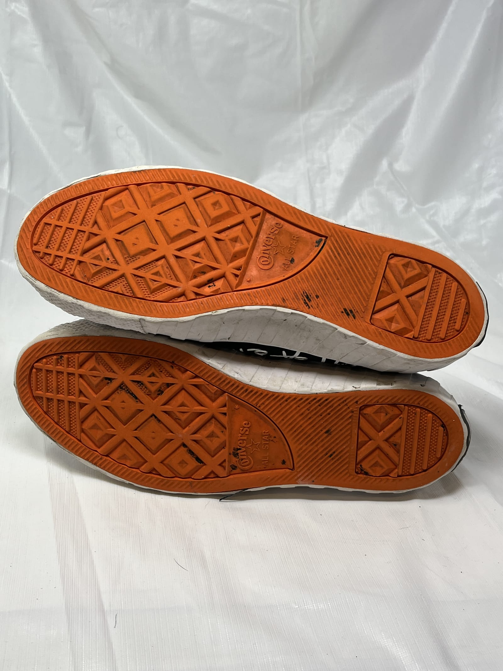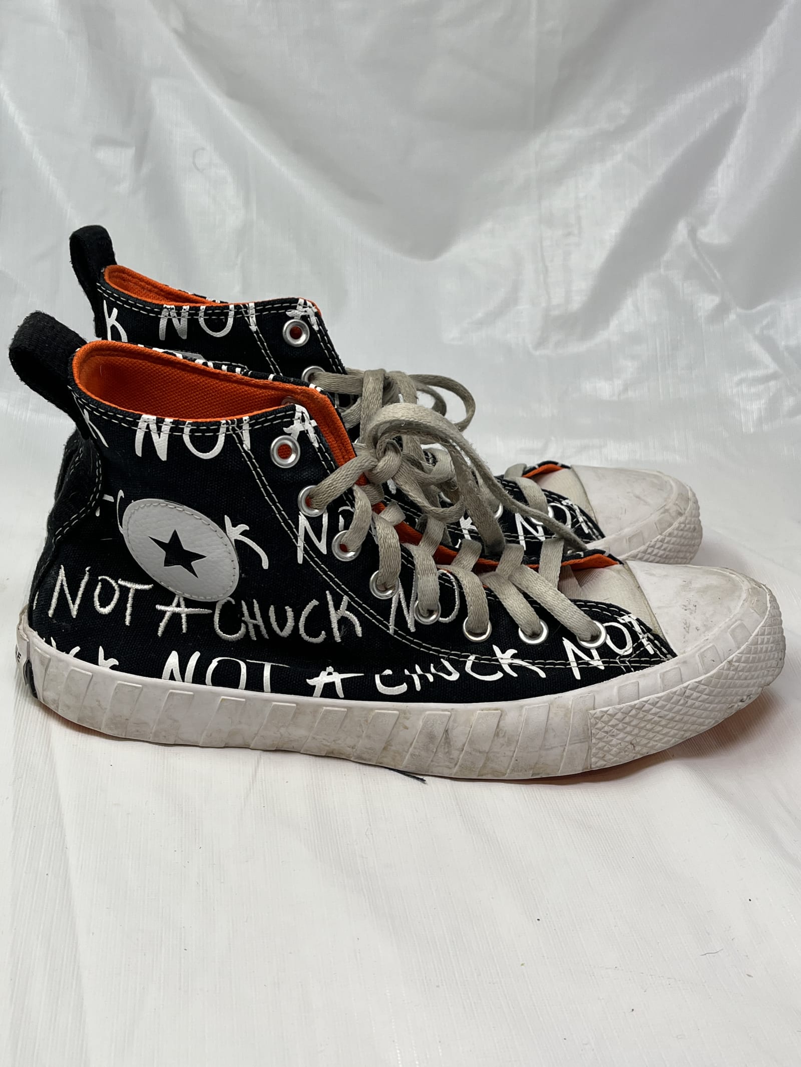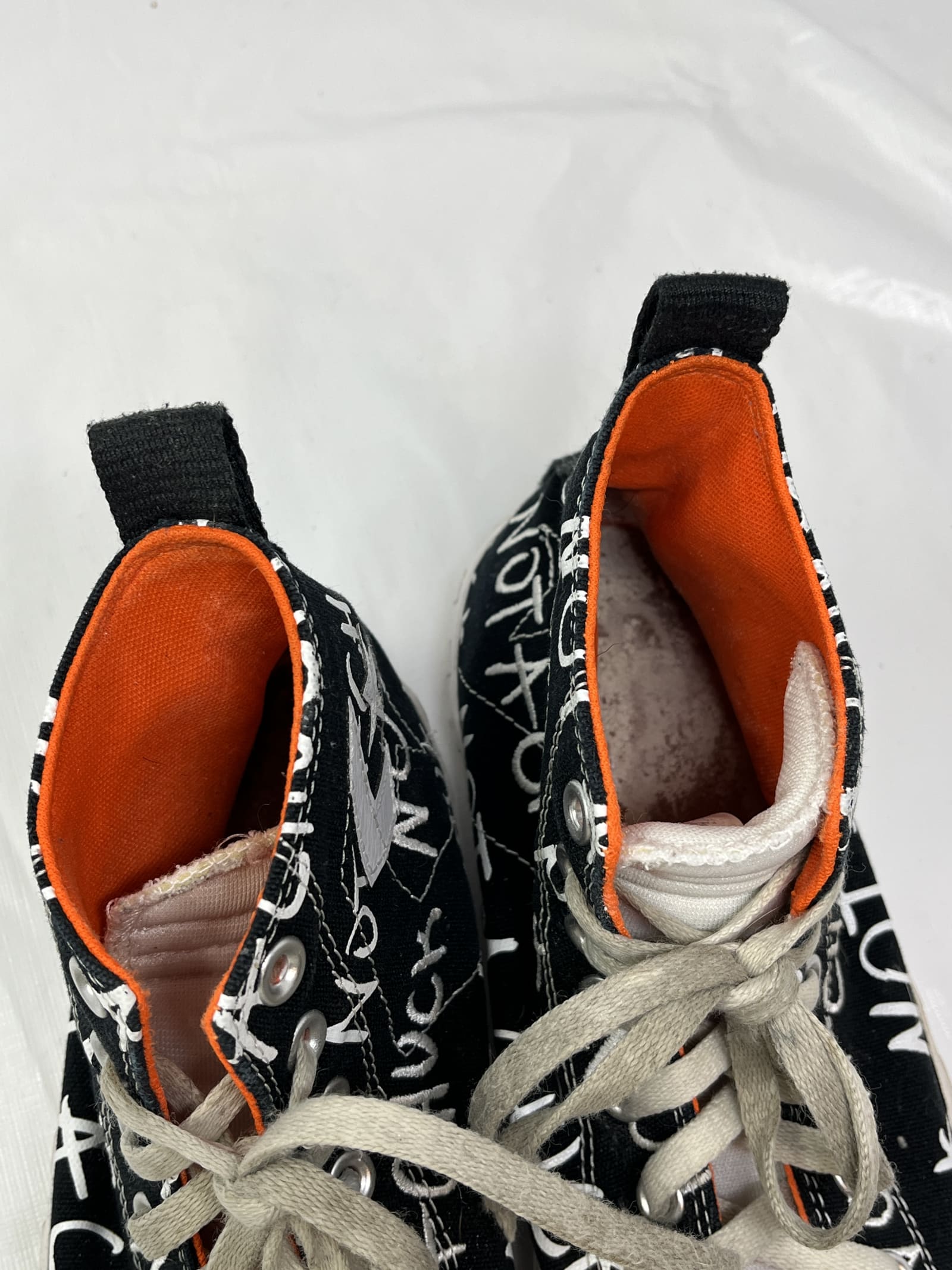 Converse UNT1TL3D Hi men’s size 9. Black/white with orange interior, graffiti details. Model 166502C. Pre-owned with sole/lace wear. Rare style with box.