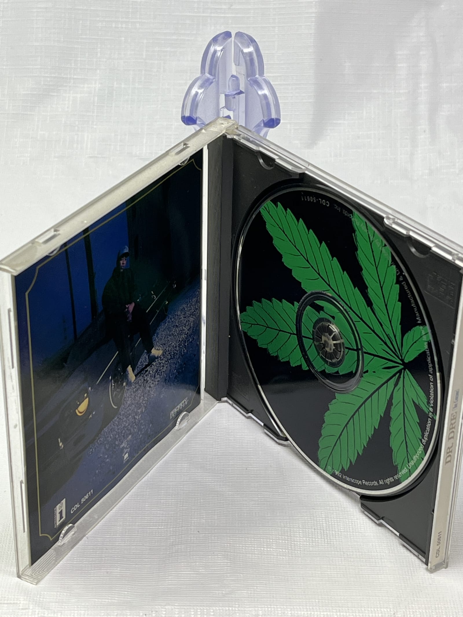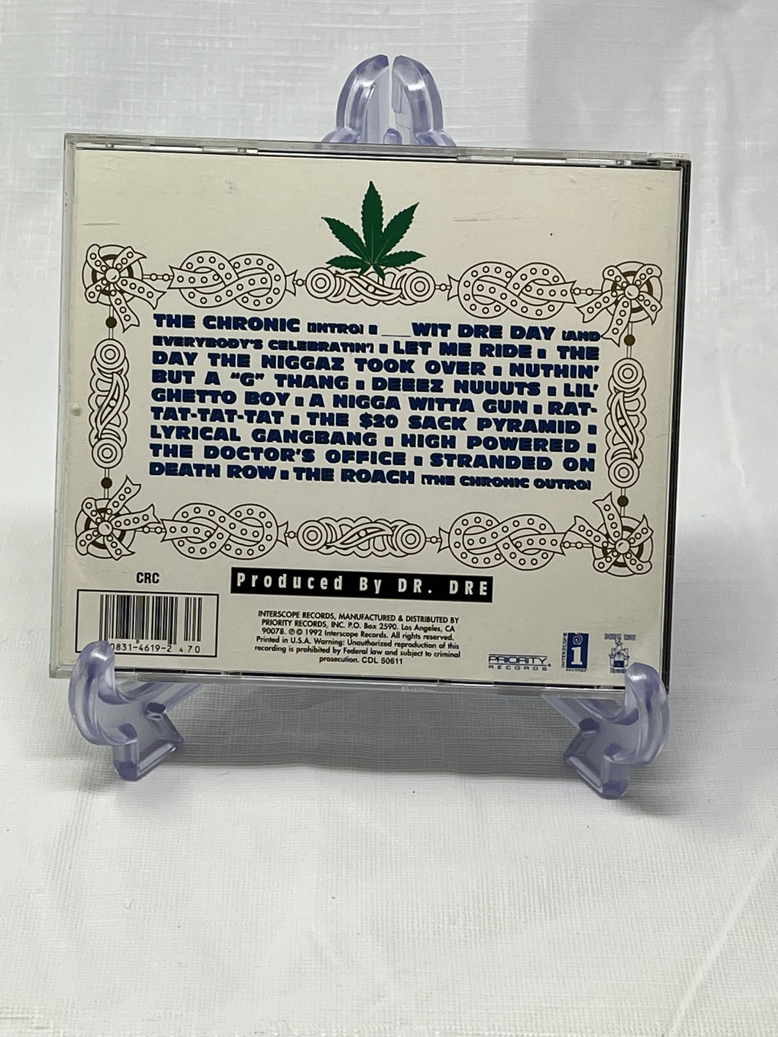 This is The Chronic by Dr. Dre on CD, a classic Hip Hop/Rap album in a jewel case with insert/booklet. Good condition overall with some visible scratches on the disc.