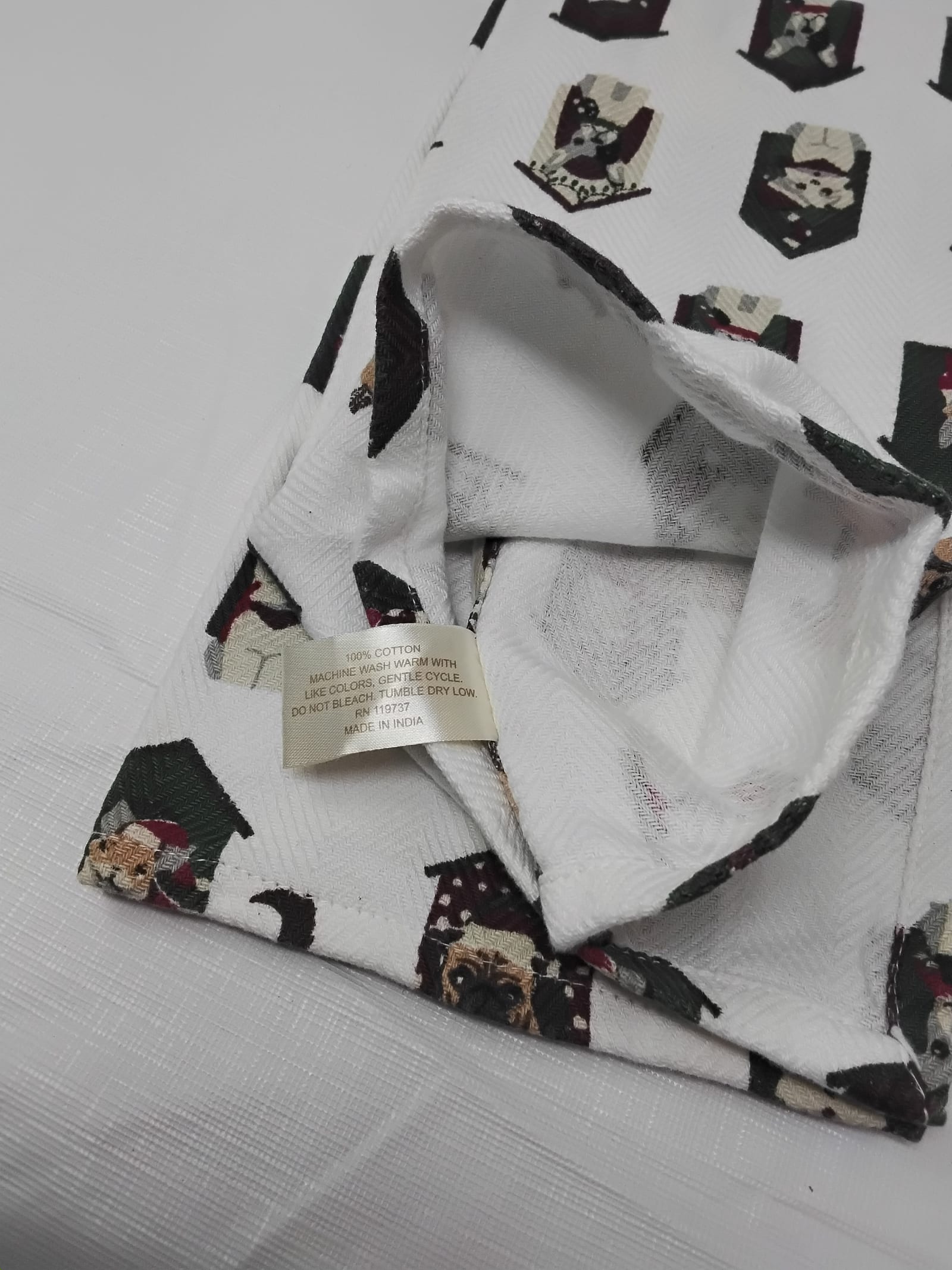 - Design: Dogs in decorated doghouses with Christmas hats and/or scarves
