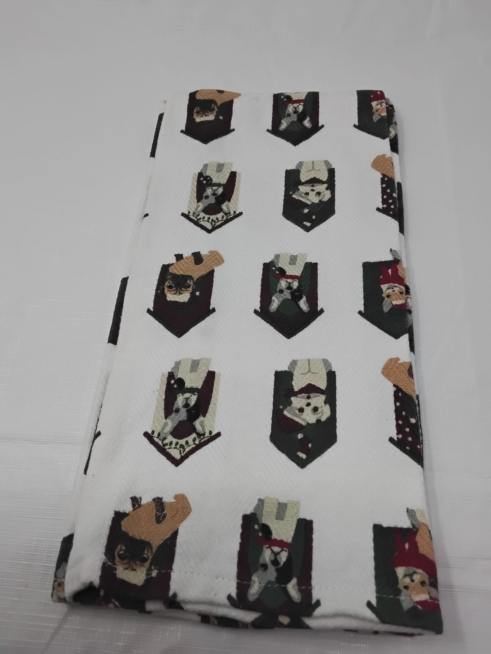 This is a festive Envogue Holiday kitchen towel featuring adorable dogs sitting in decorated doghouses, each wearing Christmas hats and/or scarves. A cheerful and charming accent for your holiday kitchen décor — perfect for the season or as a fun gift for a dog lover.