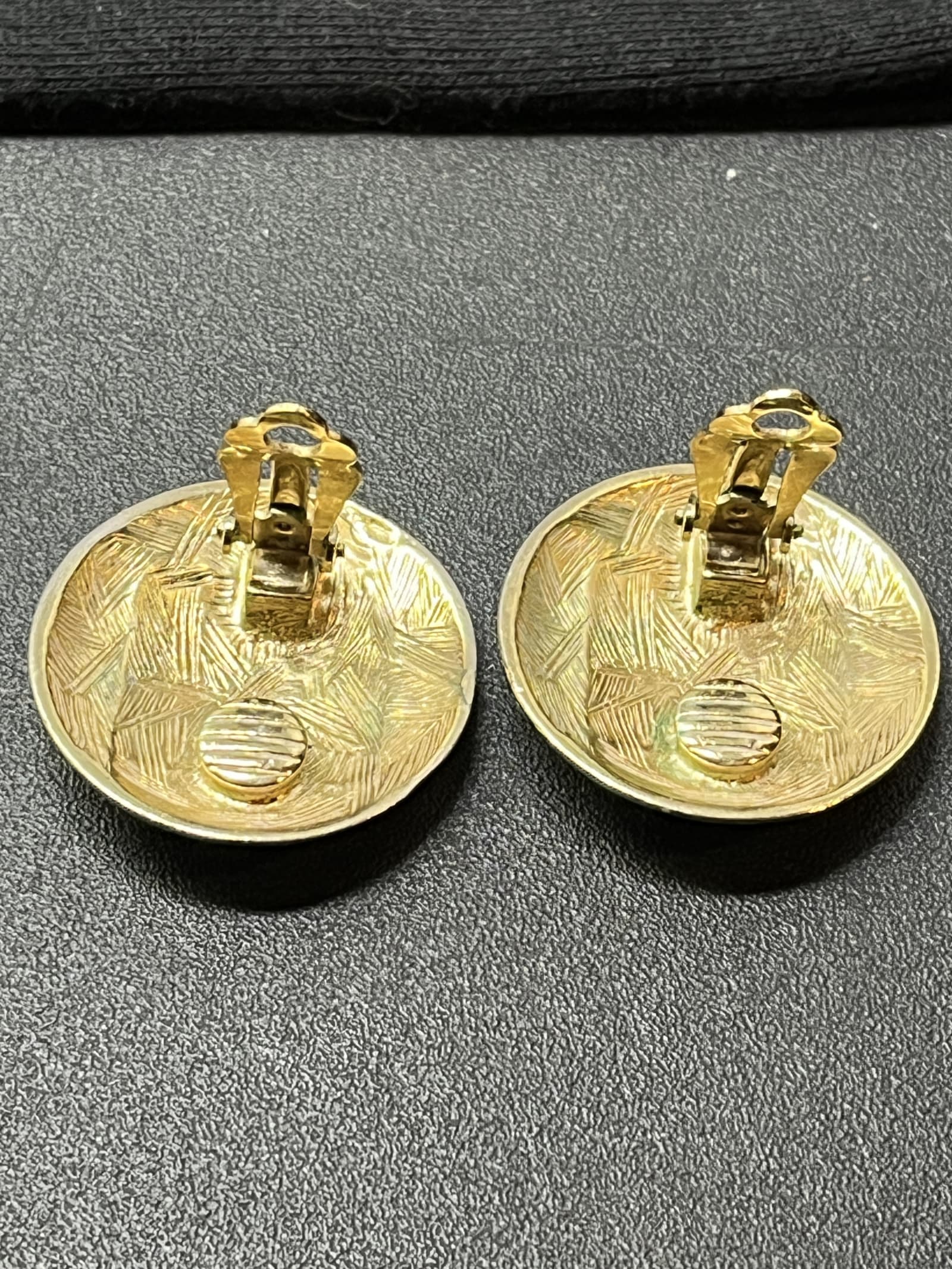 This is a pair of vintage gold-tone large logo clip-on earrings on a smooth domed base. A shiny, designer-inspired vintage accessory.