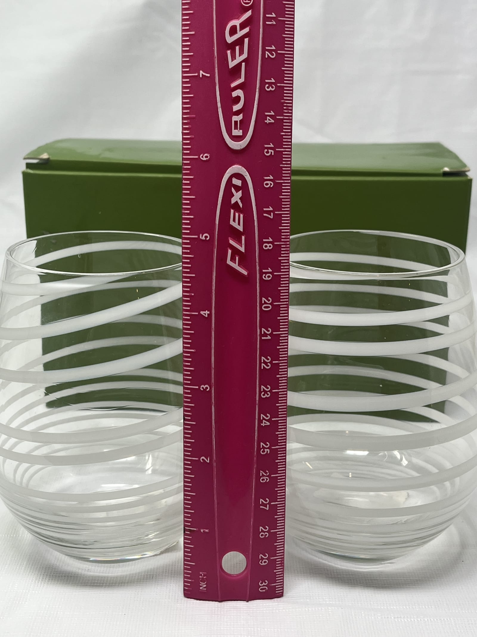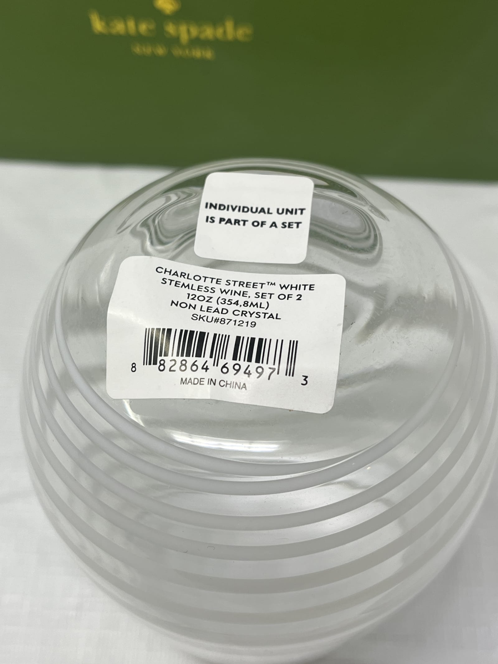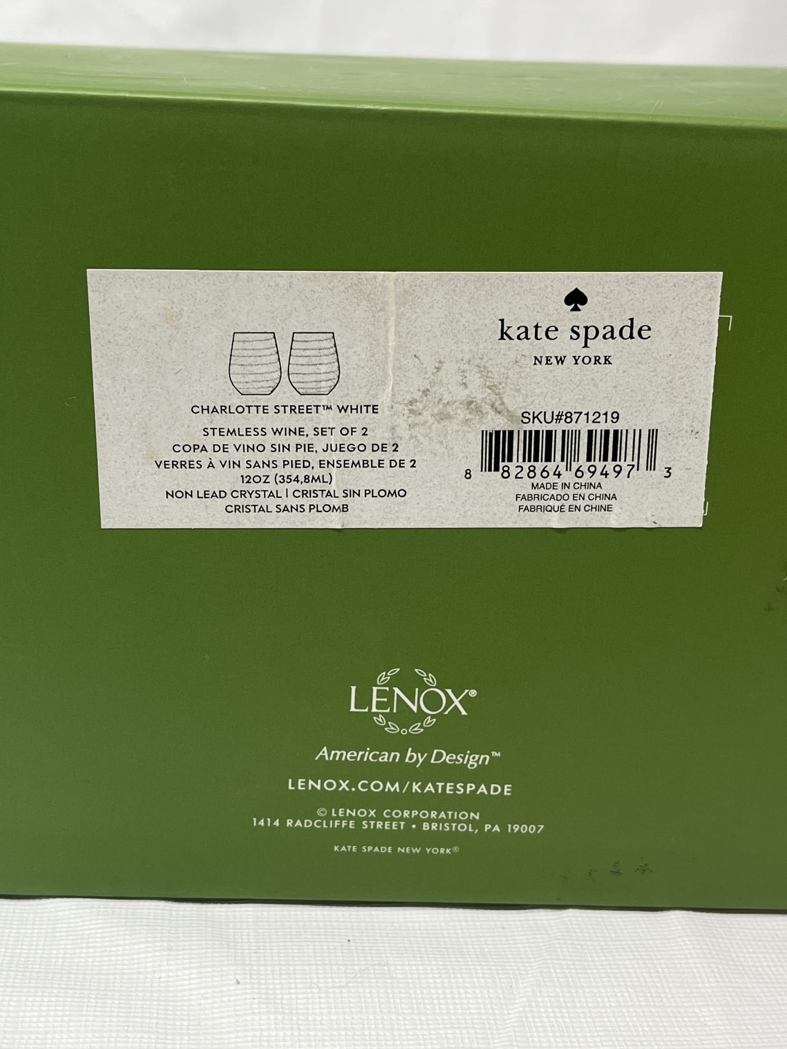 This is a beautiful Kate Spade for Lenox “Charlotte Street” stemless wine glass in clear with a white stripe accent. The original stickers are still attached, and it includes the original box. A modern and elegant design—perfect for entertaining or gifting.