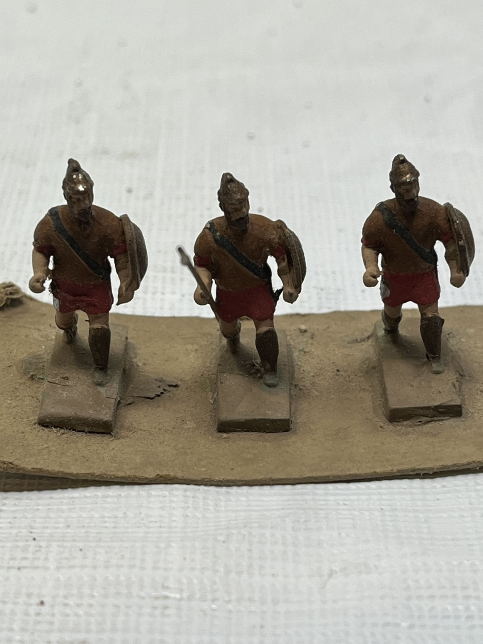 This is a mixed lot of vintage wargaming miniatures, mostly metal with a few plastic pieces included. Each figure stands at approximately 3 cm tall. Some show paint loss, several weapons have come loose but are included, and a few minis will need re-gluing to their bases. Great for repainting, kitbashing, or tabletop gaming.