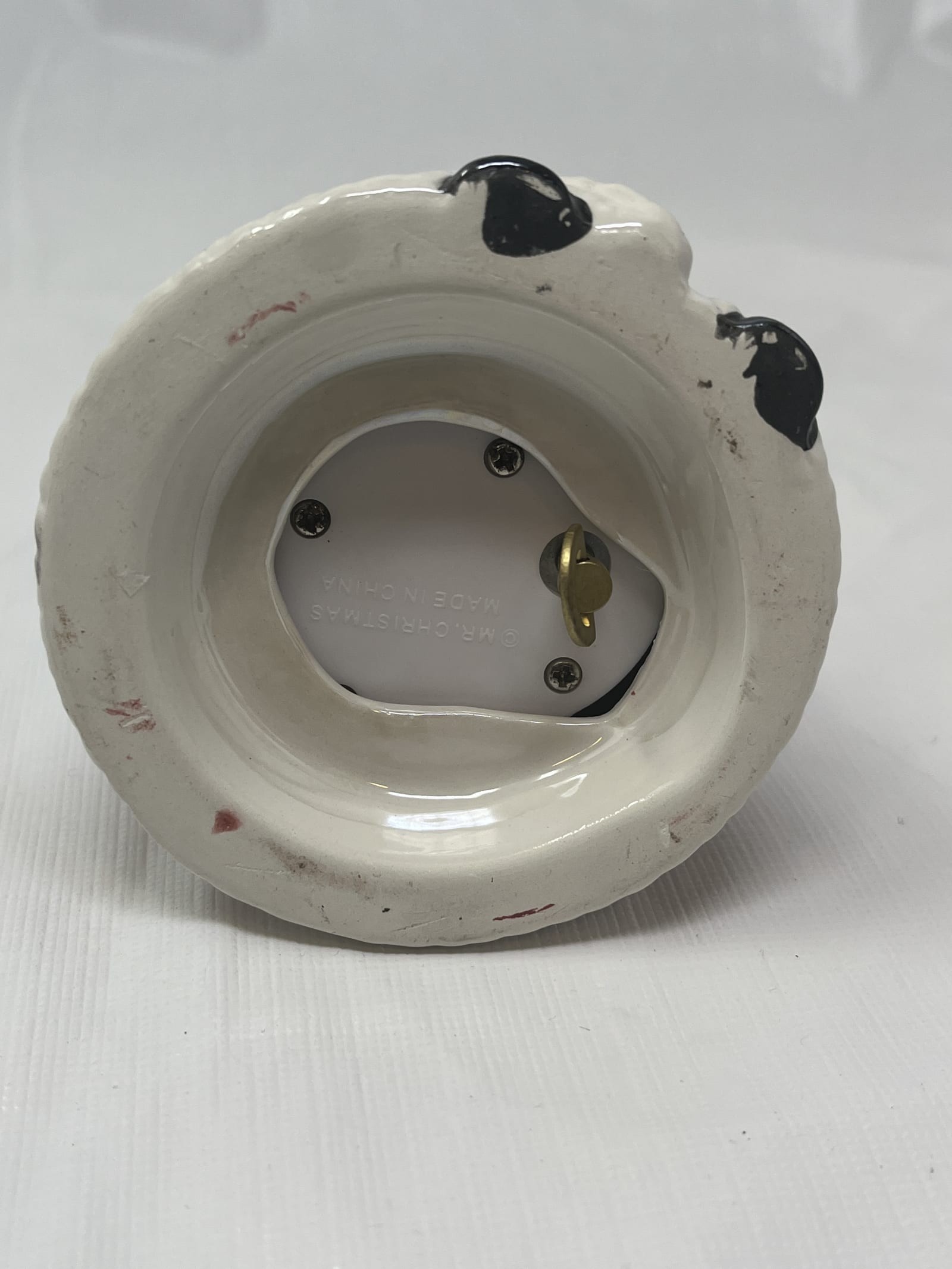 Festive ceramic Santa figurine with hinged trinket box and inside miniature village. Wind-up musical box works. Approx. 5".