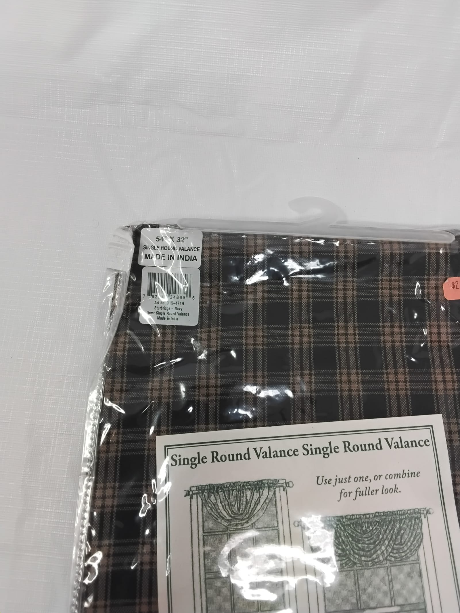 This is a Park Designs “Sturbridge” Single Round Valance in a classic navy plaid pattern. It measures 54" x 32", and contains one point valance (1 piece). Perfect for farmhouse, cottage, or country-style décor. Made in India.