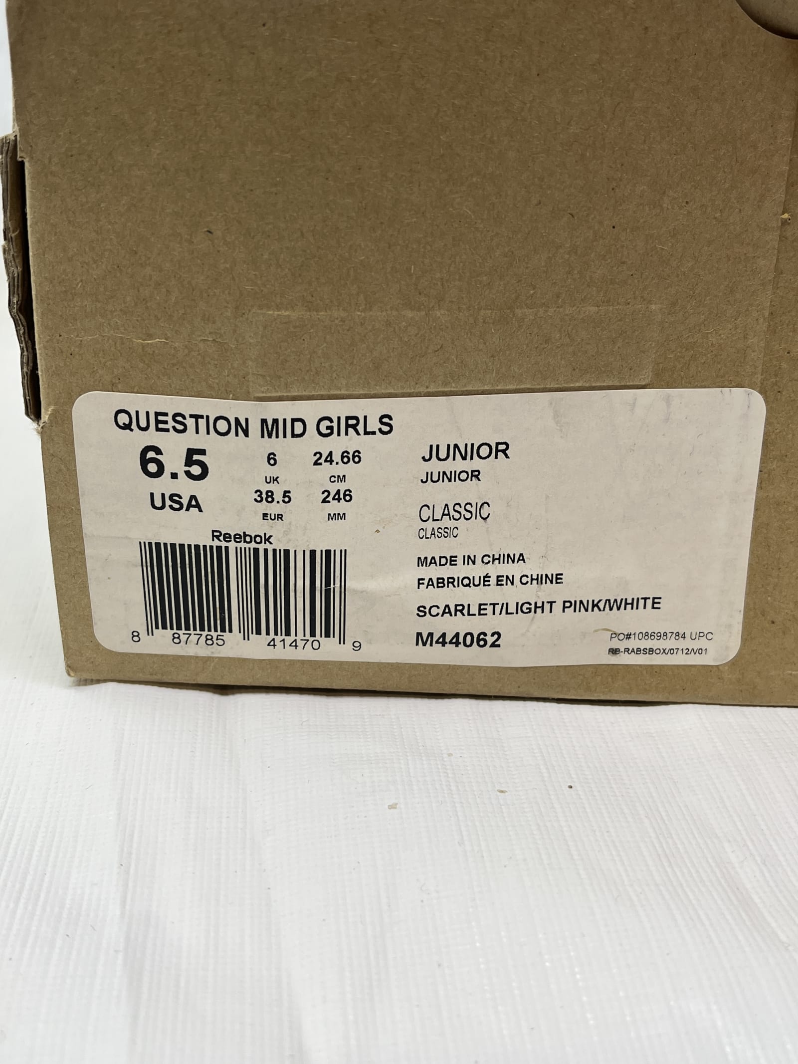 Reebok Question Mid girls size 6.5, model M44062. Scarlet/Light Pink/White. New with box, tags attached.