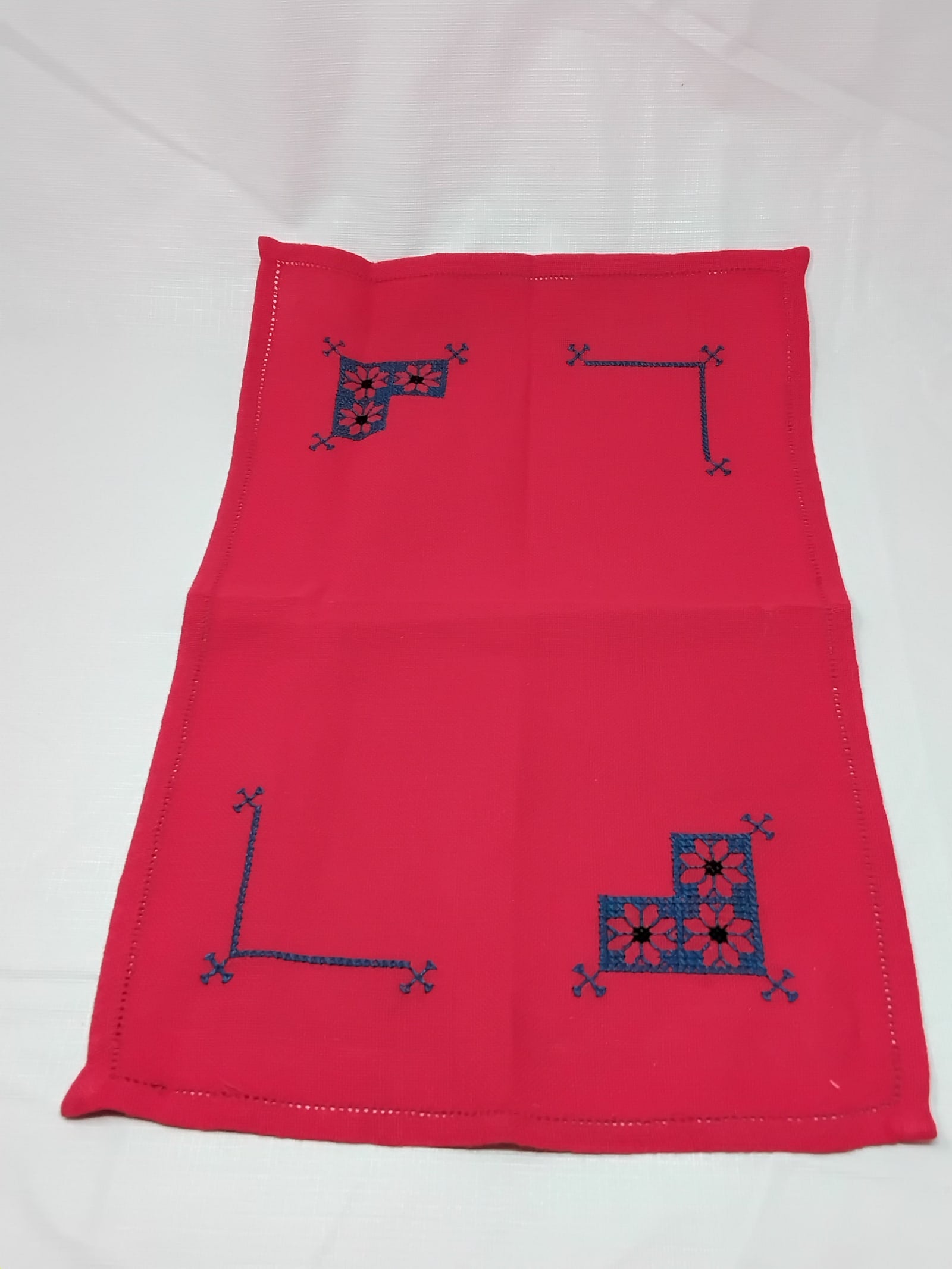 This is a charming set of 3 hand-embroidered napkins — two red and one golden yellow — each decorated with intricate blue stitching in the corners. The embroidery features geometric and floral motifs, adding a beautiful vintage or folk-art touch to your table décor.