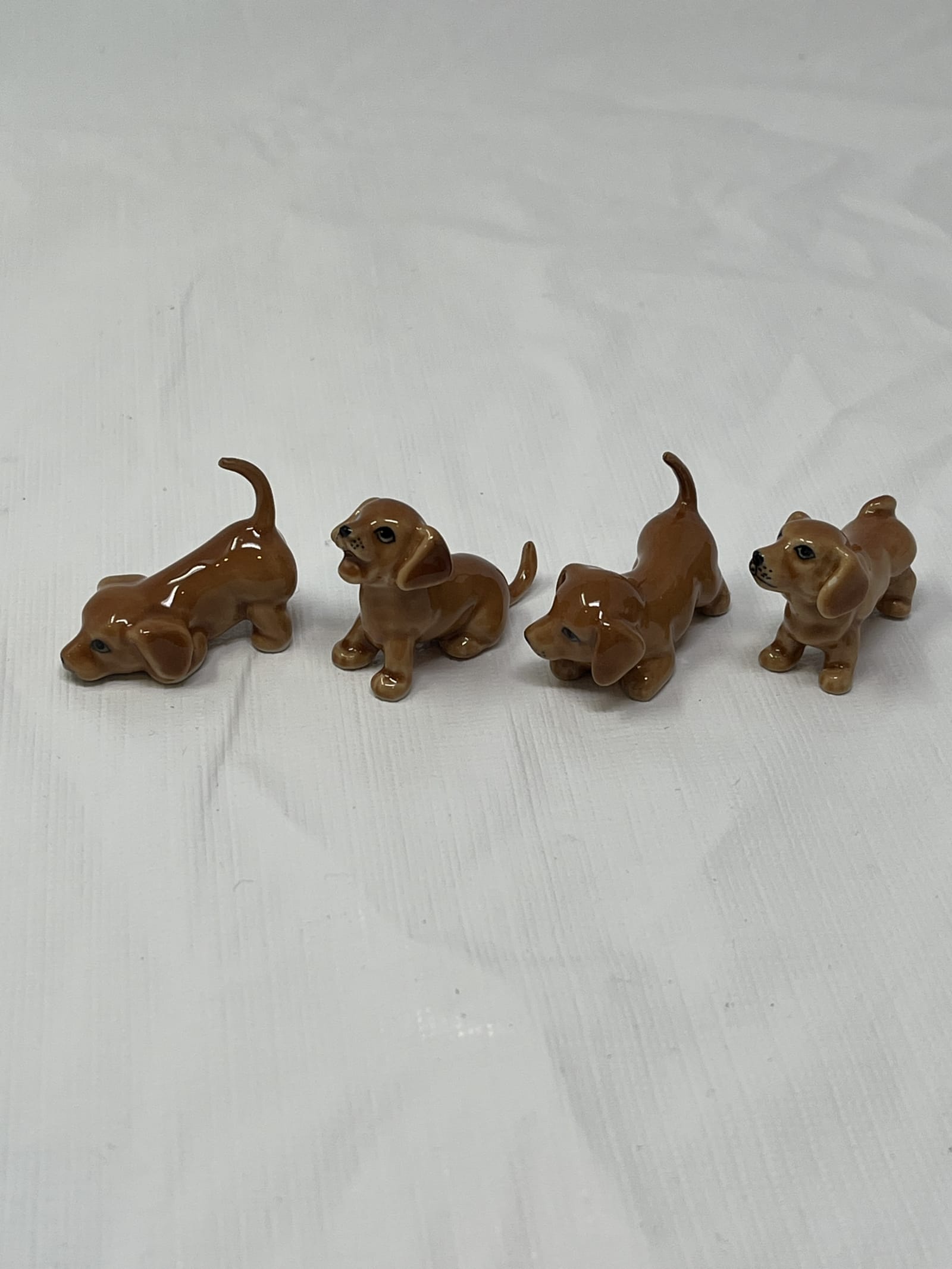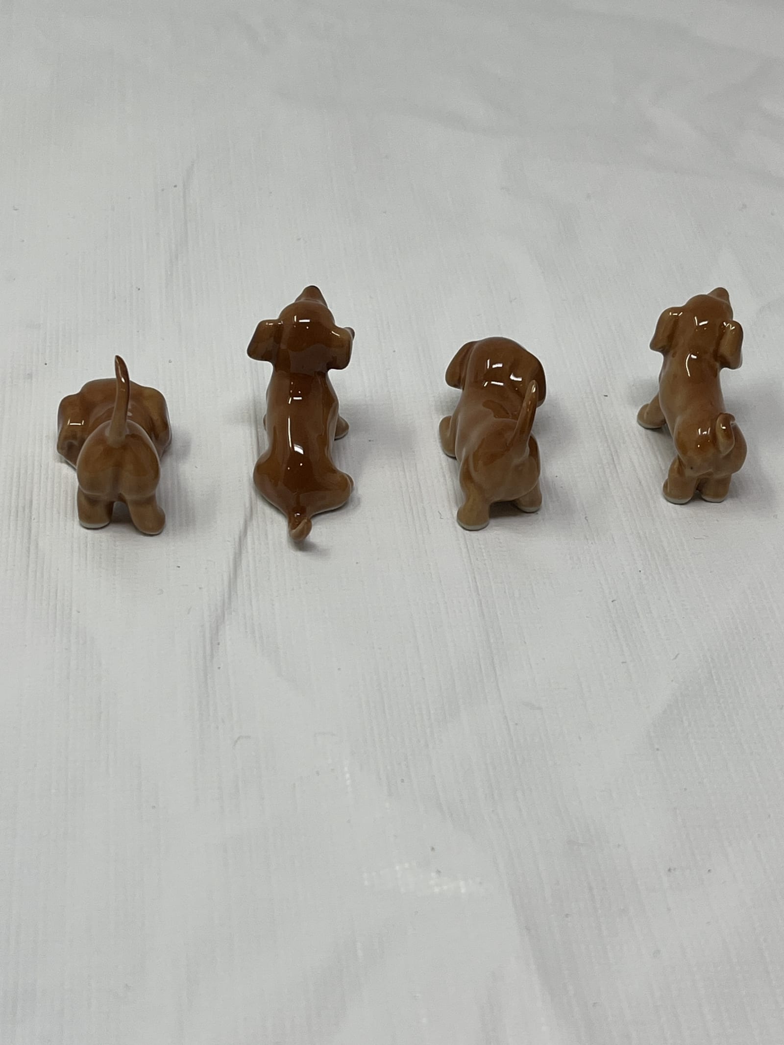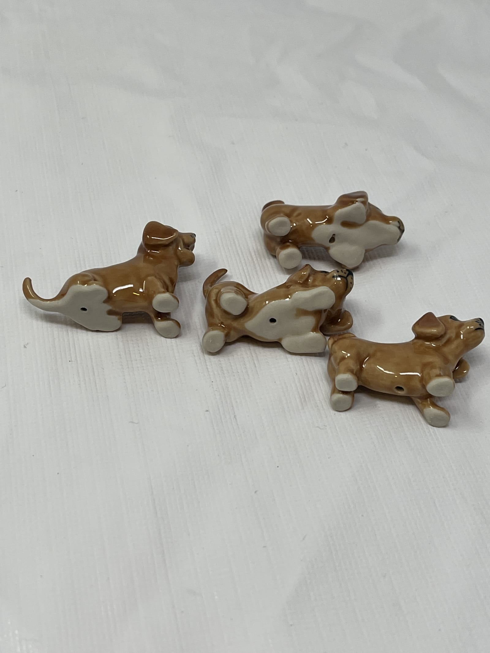 Lot of 4 tiny glazed ceramic puppies, brown with black details. Approx. 1"–1.25". Excellent condition.