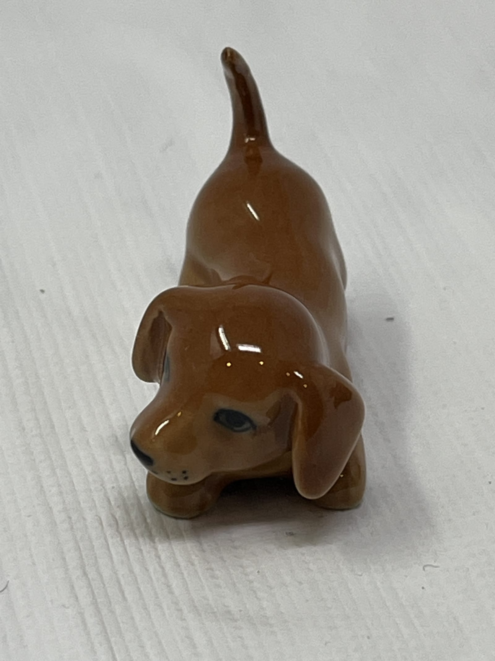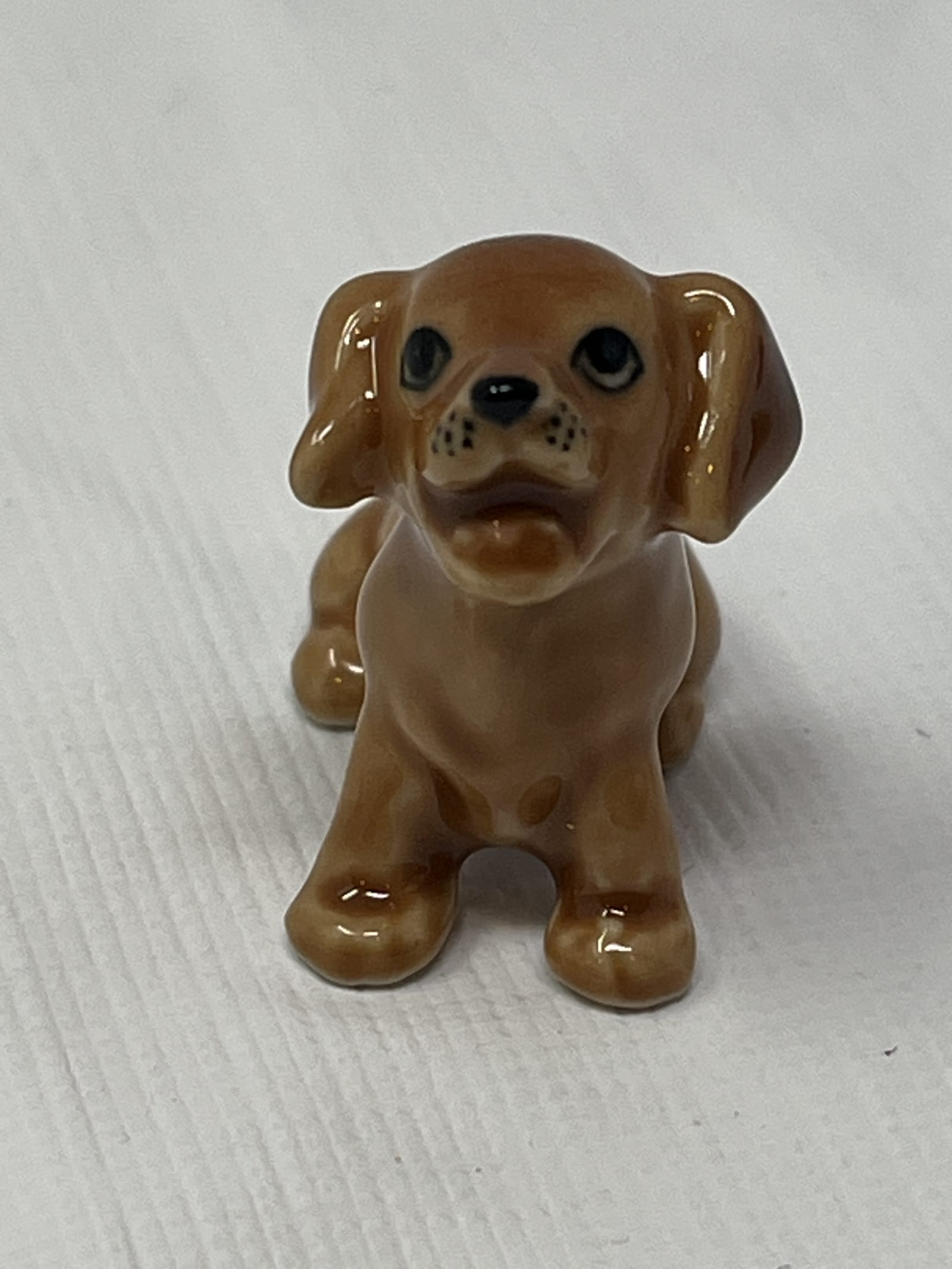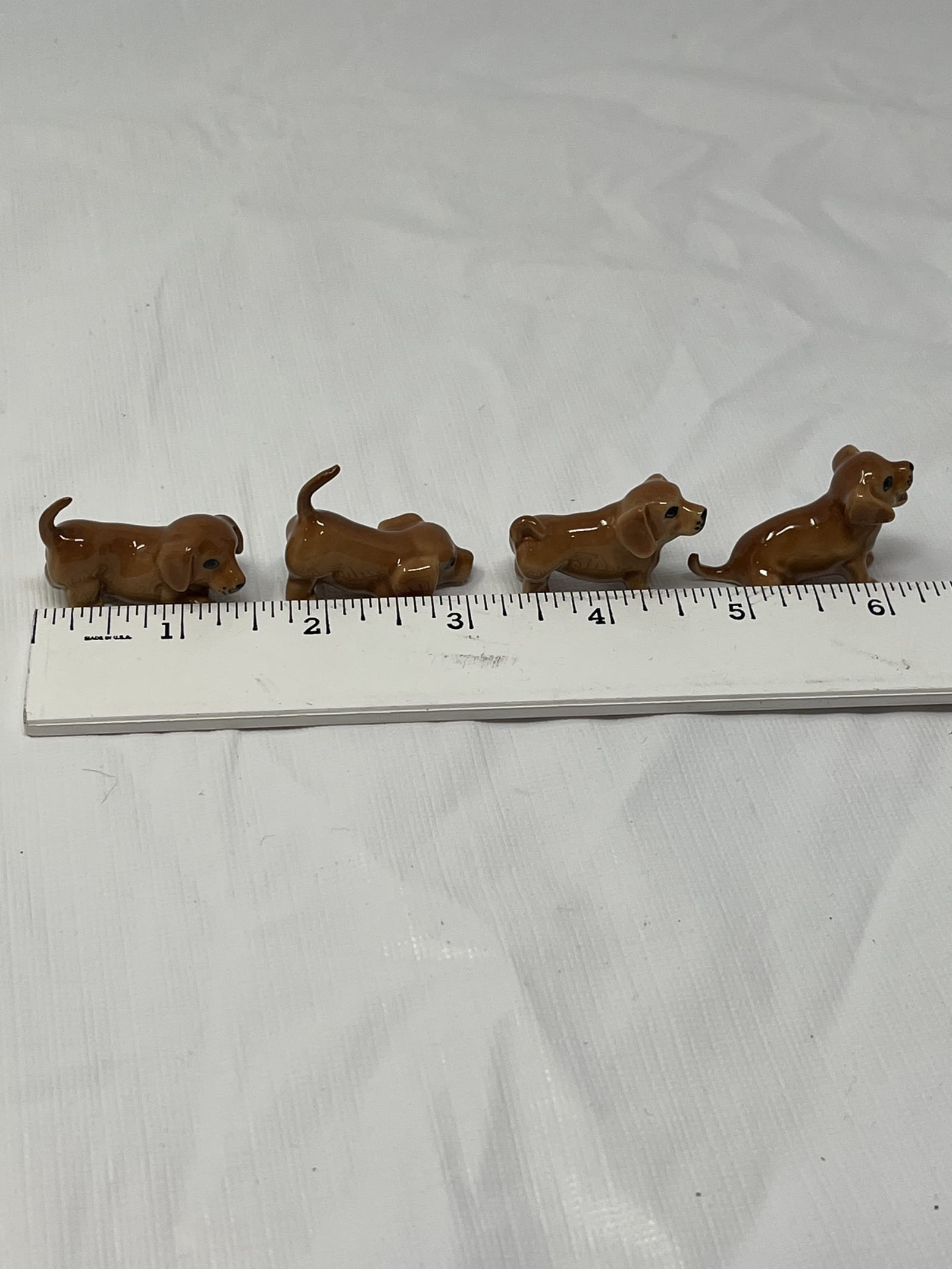 Lot of 4 tiny glazed ceramic puppies, brown with black details. Approx. 1"–1.25". Excellent condition.