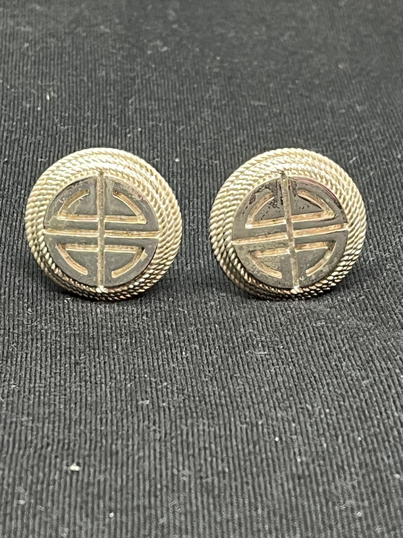Silver Tone Large Logo Clip On Earrings Rope Border Vintage