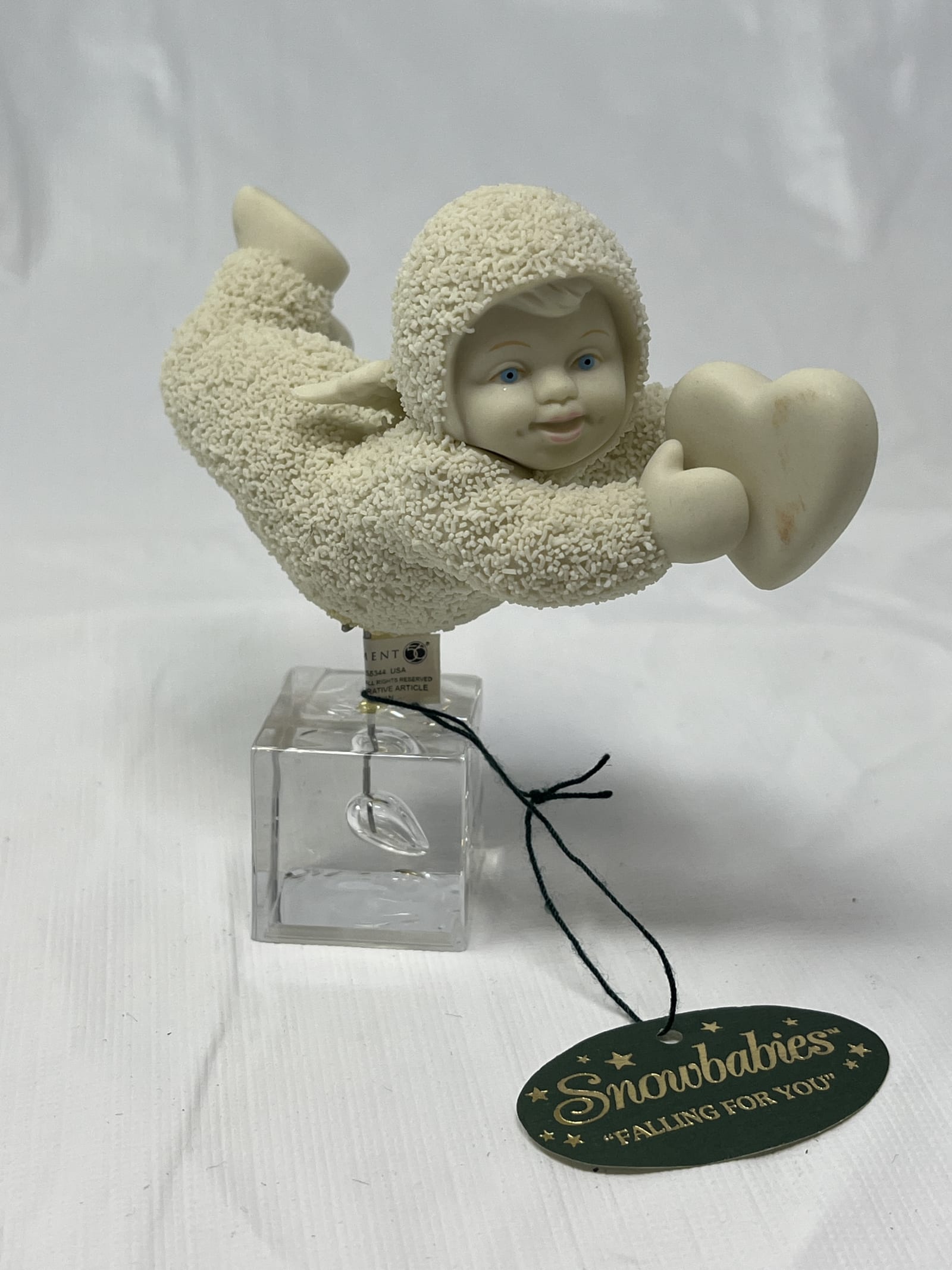 Dept 56 Snowbabies “Falling for You” (1999). Child holding heart above clear cube. Includes original hang tag. Approx. 5"x3". Excellent condition.