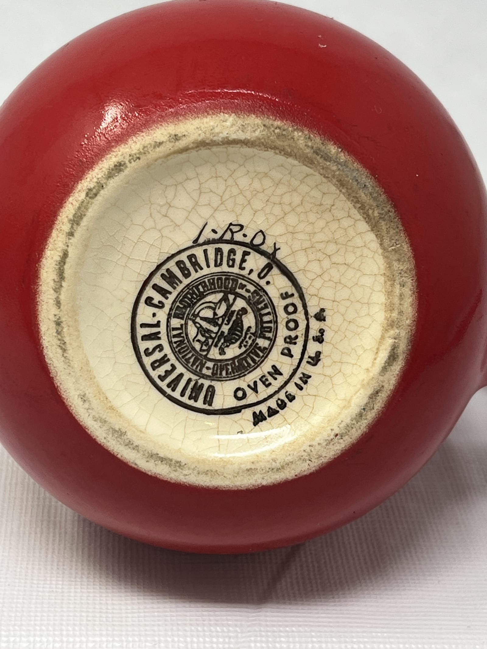 - Maker/Mark: Universal Potteries, Cambridge, Ohio — “OVEN PROOF” base stamp
