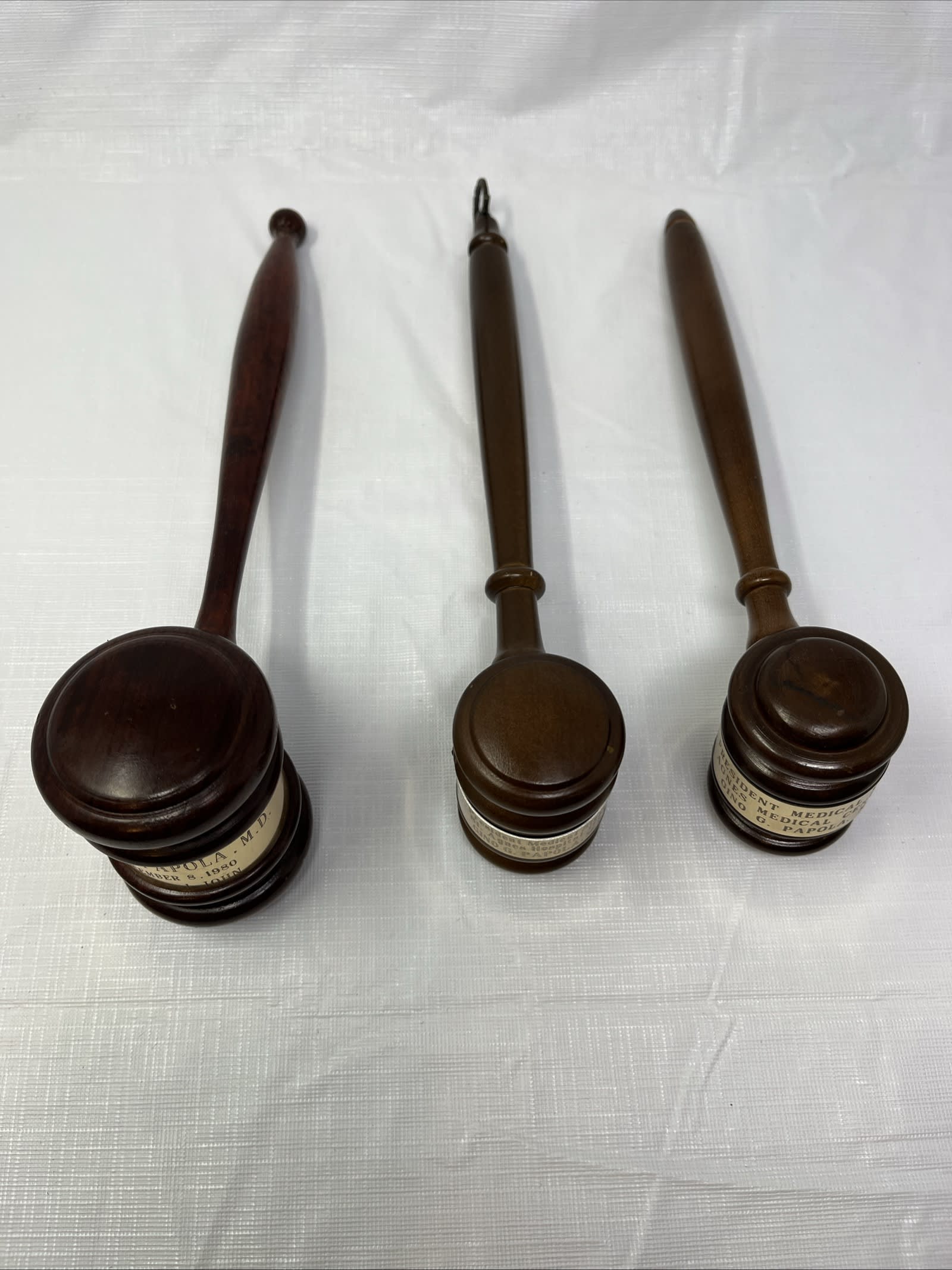 This is a set of 3 vintage wooden gavels, each featuring engraved dedication plates. Two are from 1974 and 1982, and the third is from 1980. These elegant pieces were likely used for hospital or professional recognition awards, but they could also be used by a judge, auctioneer, or for display purposes. The plates can be easily removed or replaced by unscrewing the handle or the screws, giving you flexibility to personalize or use them as generic gavels. Perfect for collectors, offices, or anyone who appreciates vintage ceremonial gavels.