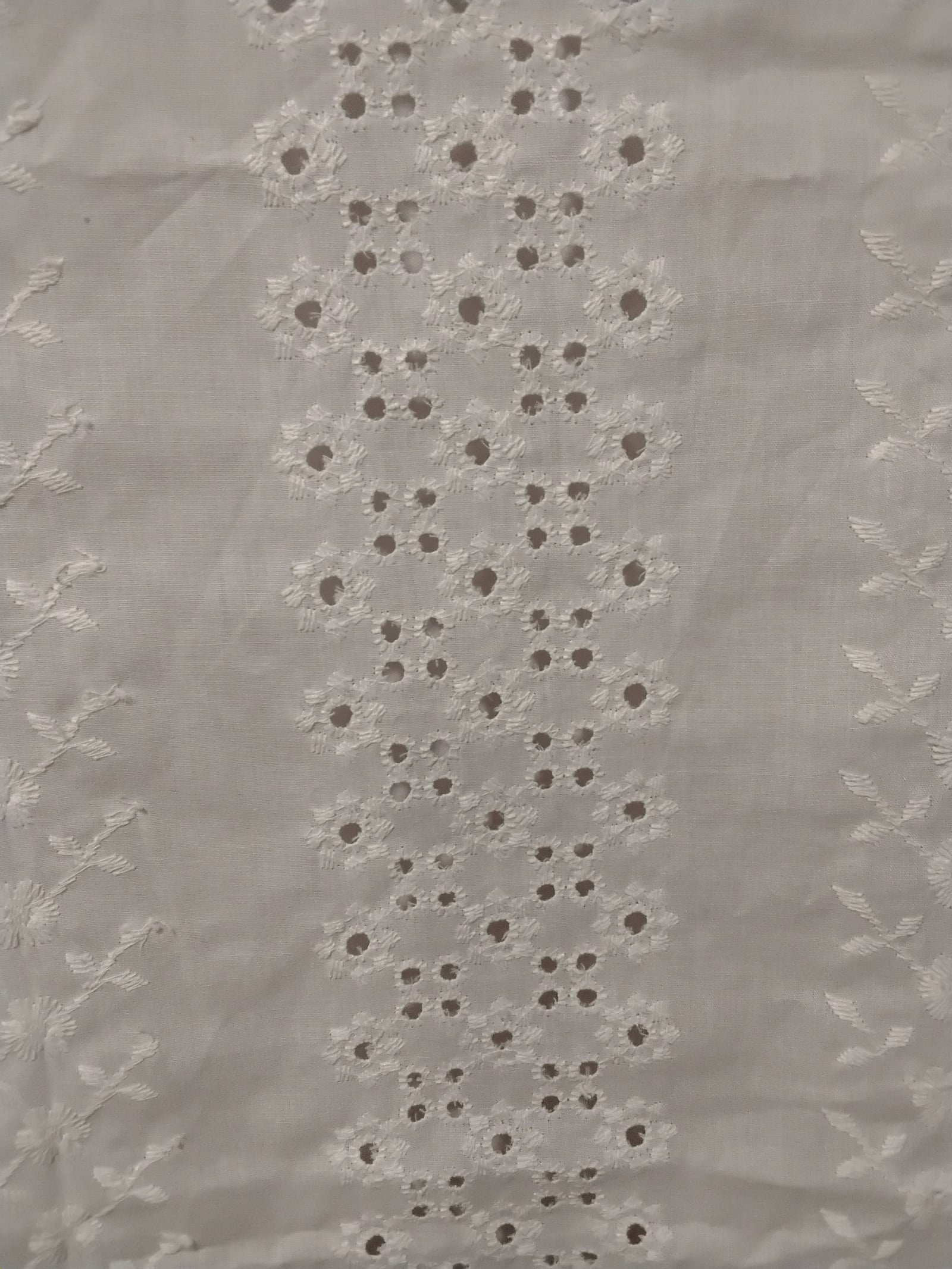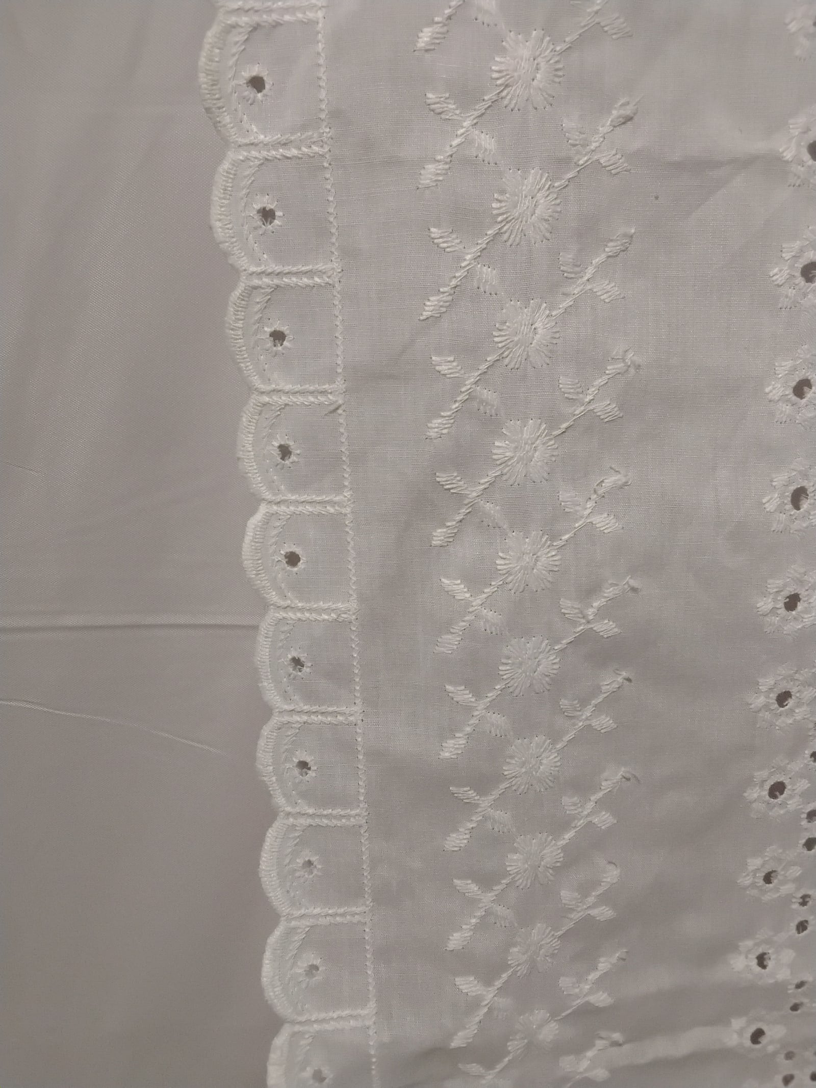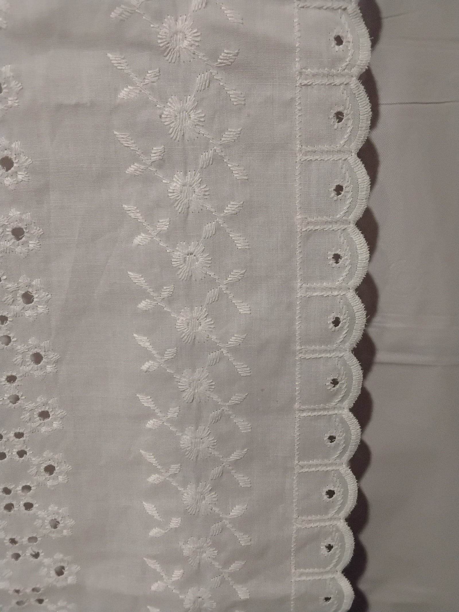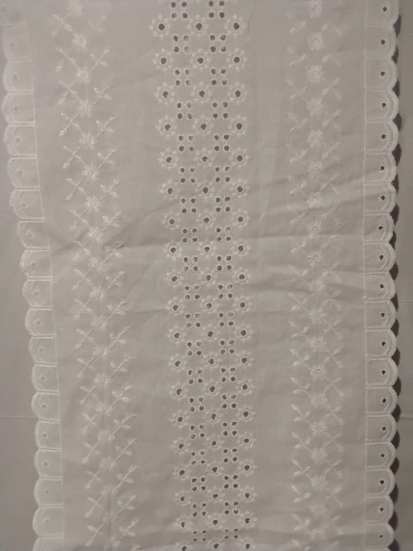 This is a white embroidered lace table runner featuring a lovely floral eyelet pattern with scalloped edges on both sides. The lightweight cotton-blend fabric brings a soft, vintage-inspired charm — perfect for dining tables, buffets, or dressers.